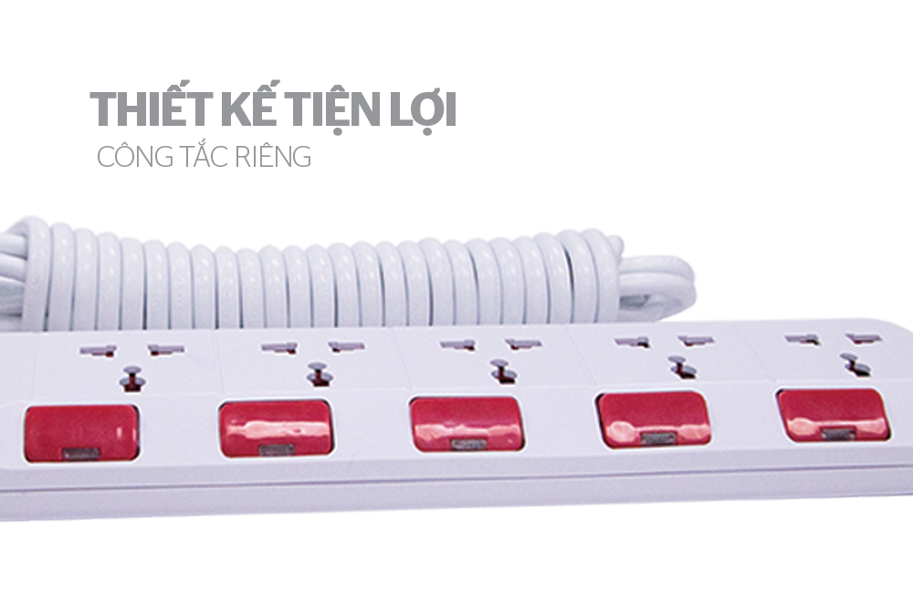 Ổ cắm điện Sunhouse SHE-OC1-5RD gọn gàng gồm 5 chấu cắm 3 và 5 công tắc đi kèm phù hợp phòng khách, nhà bếp cần sử dụng nhiều thiết bị đồng thời.