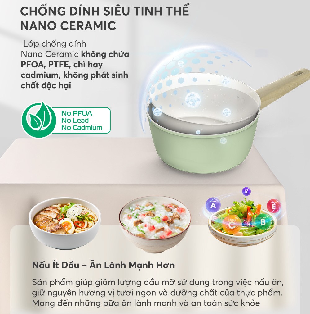 Lớp chống dính siêu tinh thể Nano Ceramic (sứ Nano) giúp lòng quánh chống dính tốt hơn, chế biến món ăn dễ dàng hơn. Chống dính Nano Ceramic không chứa PFOA, PTFE, chì hay Cadmium. An toàn khi tiếp xúc với thức ăn (khuyến cáo không để thức ăn sau chế biến quá 5 tiếng trong quánh).