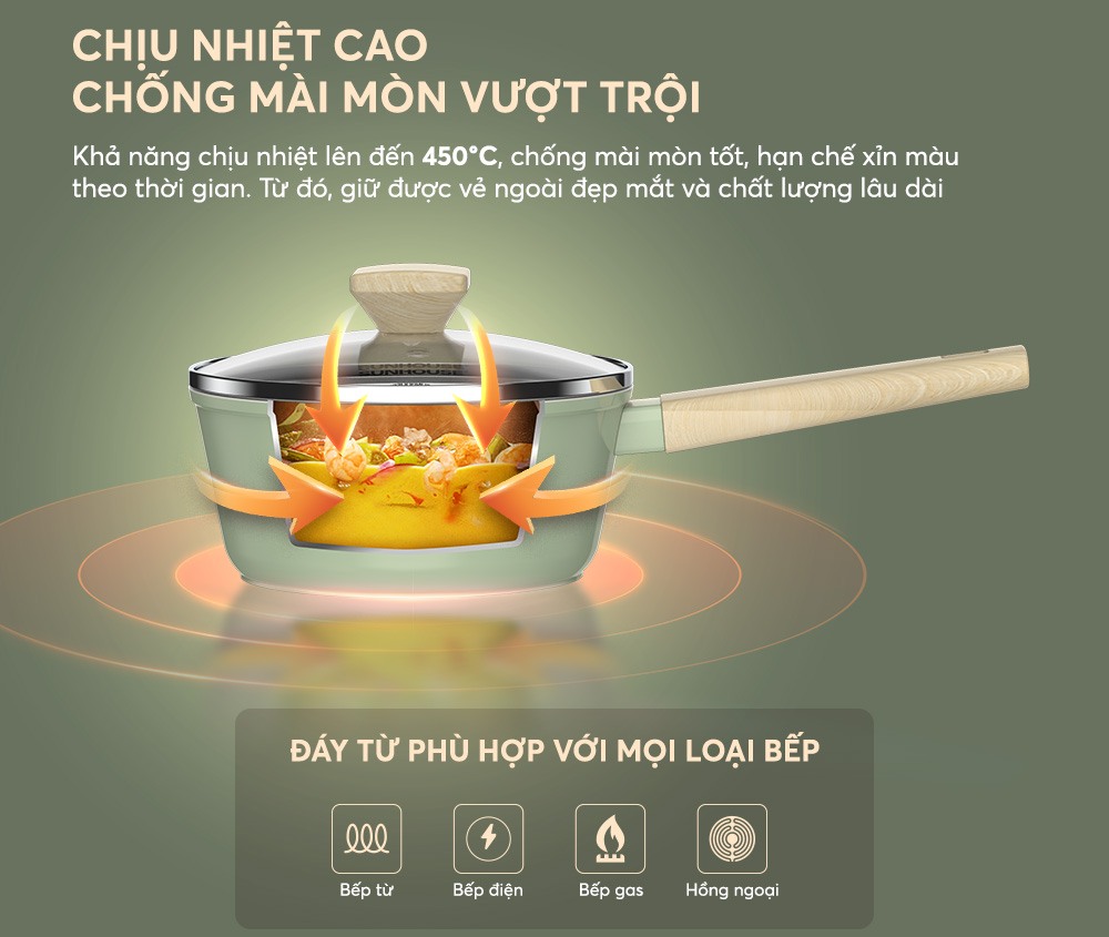 Phần đáy quánh thiết kế bắt từ tối ưu giúp truyền nhiệt nhanh, chống trượt, tương thích với mọi loại bếp như bếp điện từ, bếp gas, bếp hồng ngoại, bếp điện kể cả các dòng bếp từ nhập khẩu công suất cao.