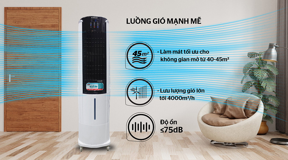 Với lưu lượng gió lên đến 4000m³/giờ, luồng gió được thổi đi với tốc độ nhanh. Đồng thời kết hợp với tấm làm mát và lưới lọc bụi sẽ giúp luồng gió mát hơn và trong lành.