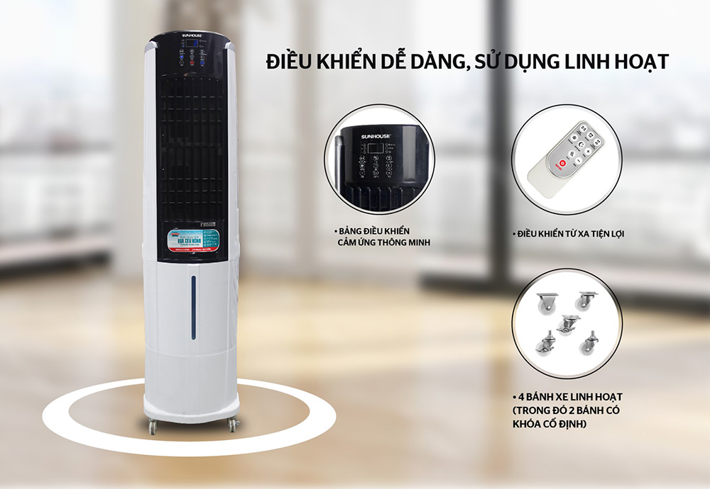 Quạt điều hòa không khí Sunhouse SHD7737 hoạt động mạnh mẽ tạo luồng gió mát, giải nhiệt cơn nóng với 4 tốc độ gió mát. Phù hợp sử dụng nơi có diện tích 40-45m² như phòng khách, quán cafe, quán ăn, văn phòng,…dễ dàng di chuyển quạt khắp phòng với bánh xe dưới chân quạt.