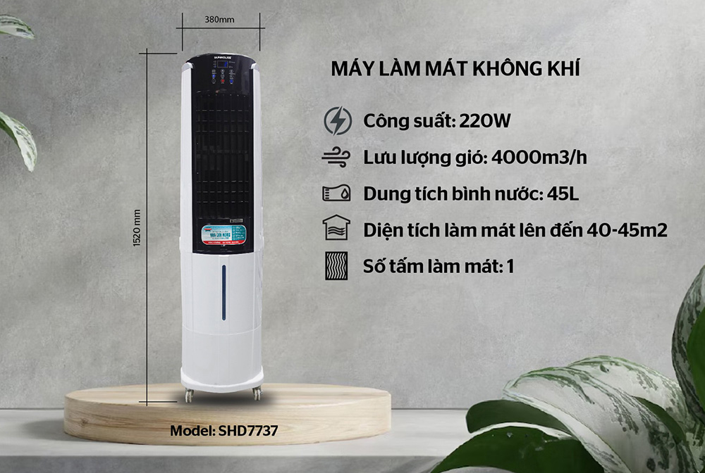 Quạt điều hòa không khí phù hợp sử dụng cho không gian mở hoặc có diện tích lớn, thế nhưng sản phẩm lại không hề tốn quá nhiều chi phí điện năng. Với công suất chỉ bằng 1/10 điều hòa không khí thông thường, SHD7737 còn hạn chế tiếng ồn, hạn chế ảnh hưởng đến sinh hoạt xung quanh.