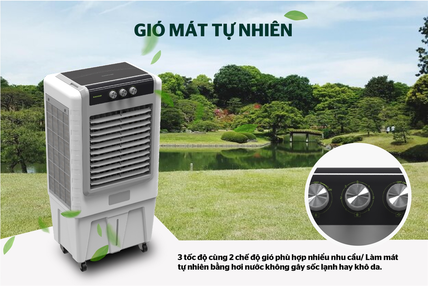 Hoạt động mạnh mẽ tạo luồng gió mát, giải nhiệt cơn nóng với 3 tốc độ gió và 2 chế độ làm mát, phù hợp sử dụng nơi có diện tích đến 65m² như sử dụng trong quán cafe, nhà hàng, nhà xưởng,…dễ dàng di chuyển quạt khắp phòng với 4 bánh xe bên dưới quạt.