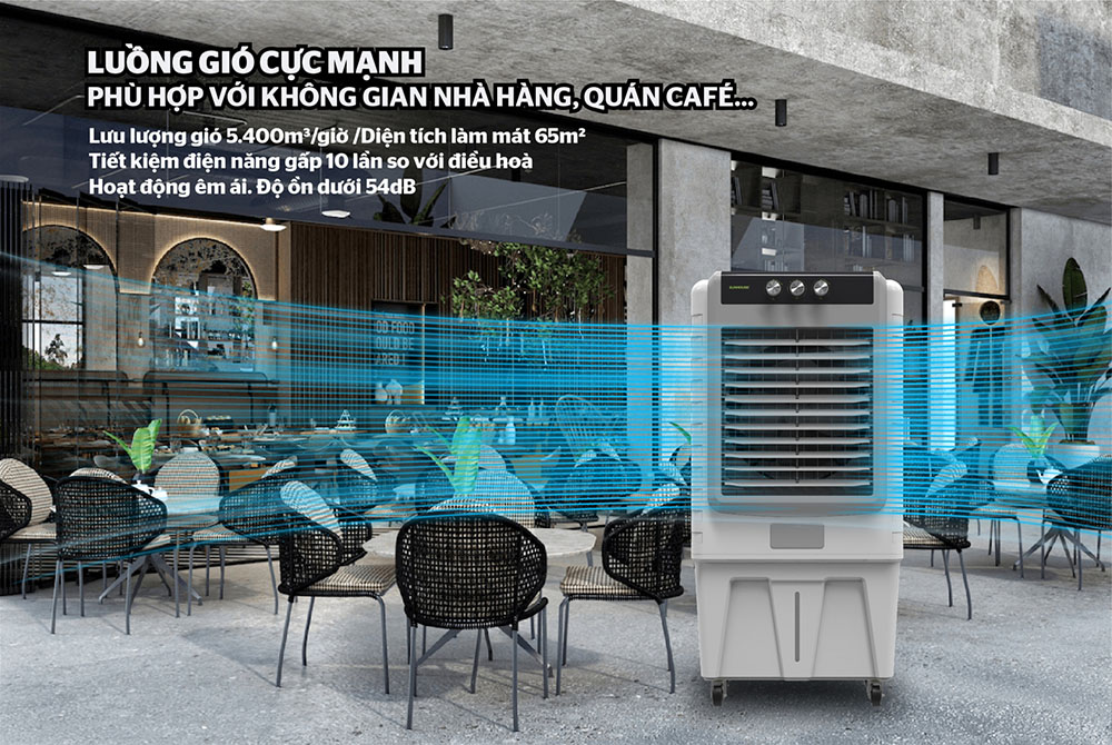 Sử dụng ở không gian mở và lớn nhưng sản phẩm lại không hề tốn quá nhiều chi phí điện năng. Với công suất chỉ bằng 1/10 điều hòa không khí thông thường, sản phẩm còn không gây ra tiếng ồn quá lớn (dưới 54dB), không ảnh hưởng đến sinh hoạt xung quanh.