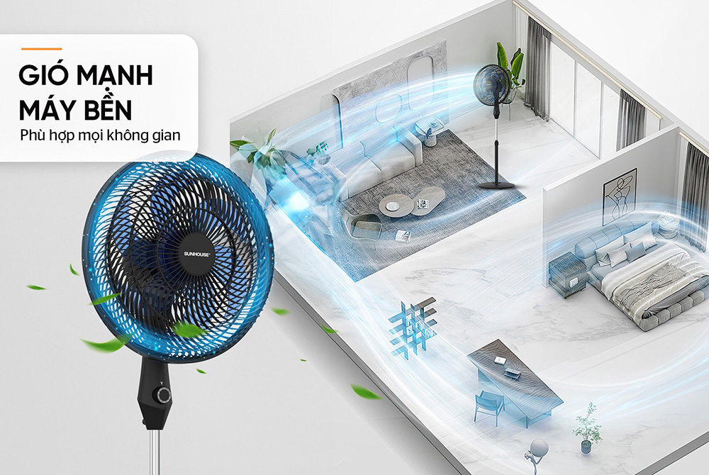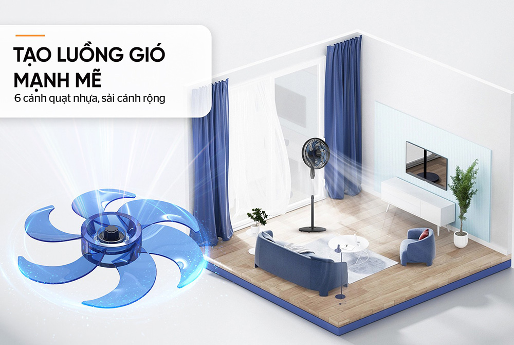 Quạt sở hữu 6 cánh quạt nhựa cao cấp cùng đường kính sải cánh 40cm giúp tăng lưu lượng gió và phân bổ không khí đồng đều khắp không gian. Luồng gió tạo ra mạnh mẽ nhưng vẫn êm dịu, mang lại cảm giác mát tự nhiên và dễ chịu.