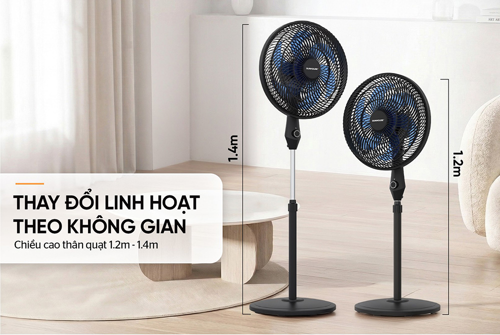 Quạt đứng cao cấp Sunhouse SHD7361B sẽ là sự lựa chọn lý tưởng cho phòng ngủ, phòng làm việc, phòng khách trong gia đình. Quạt có thể thay đổi chiều cao linh hoạt từ 120cm đến 140cm thuận tiện trong việc sử dụng mà không cần di chuyển quạt đi nhiều nơi.