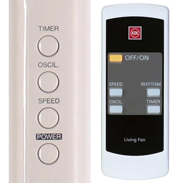 Ngoài bảng điều khiển nút nhấn trực tiếp trên thân quạt, quạt còn được trang bị remote điều khiển từ xa với các tùy chỉnh bật/tắt, chọn tốc độ gió, chế độ đảo gió (bật quay quạt) và chức năng hẹn giờ tắt.