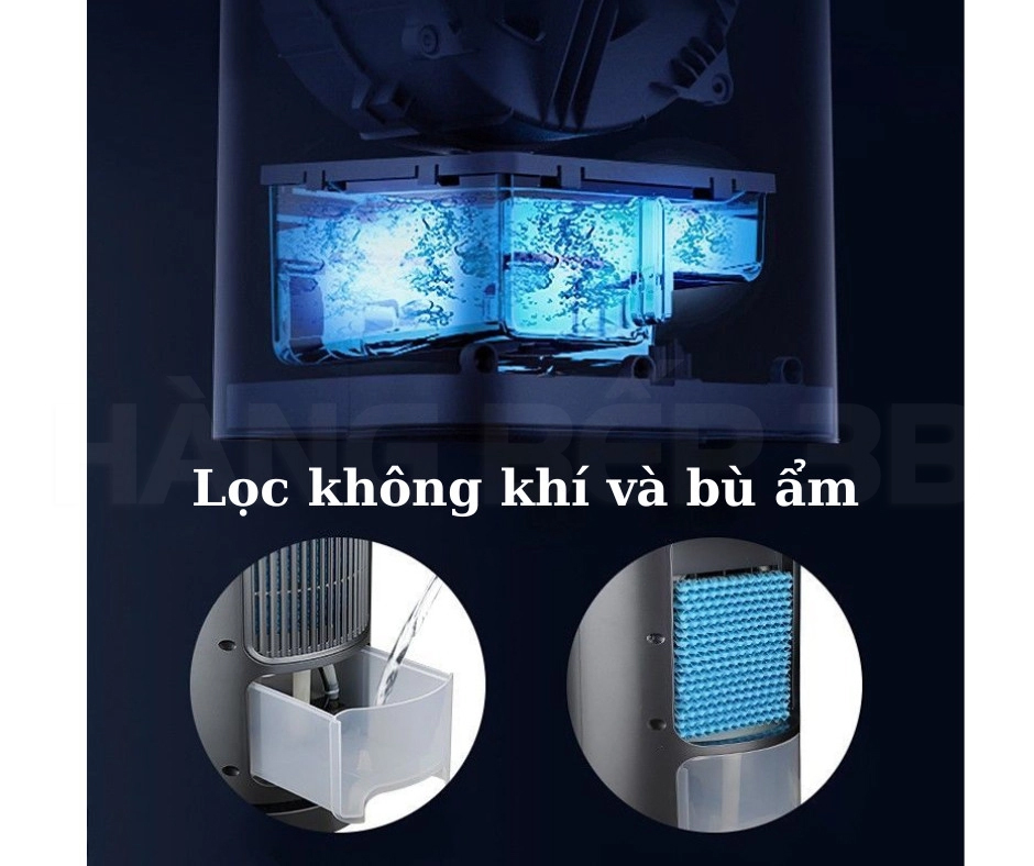 Ở phía dưới chân đế của quạt có một lõi lọc không khí công nghệ HEPA than hoạt tính mới nhất. Lõi lọc 3 lớp này có tác dụng lọc hết bụi và diệt khuẩn được hút vào máy, công nghệ lọc HEPA giúp máy lọc được cả những hạn bụi mịn (bụi siêu vi) cực kỳ nguy hiểm cho sức khỏe. Sau khi lọc bụi và diệt khuẩn sẽ tạo ion âm tốt cho sức khỏe, ion âm giúp khử mùi, mang lại không khí sạch, hỗ trợ cải thiện hô hấp.