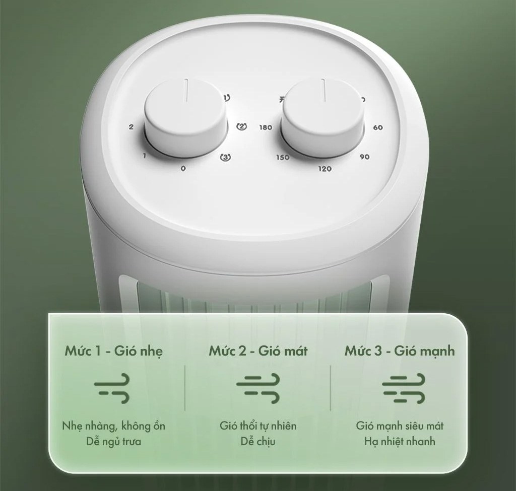 Trên đầu của quạt gồm núm xoay chọn tốc độ gió và núm xoay hẹn thời gian tắt.