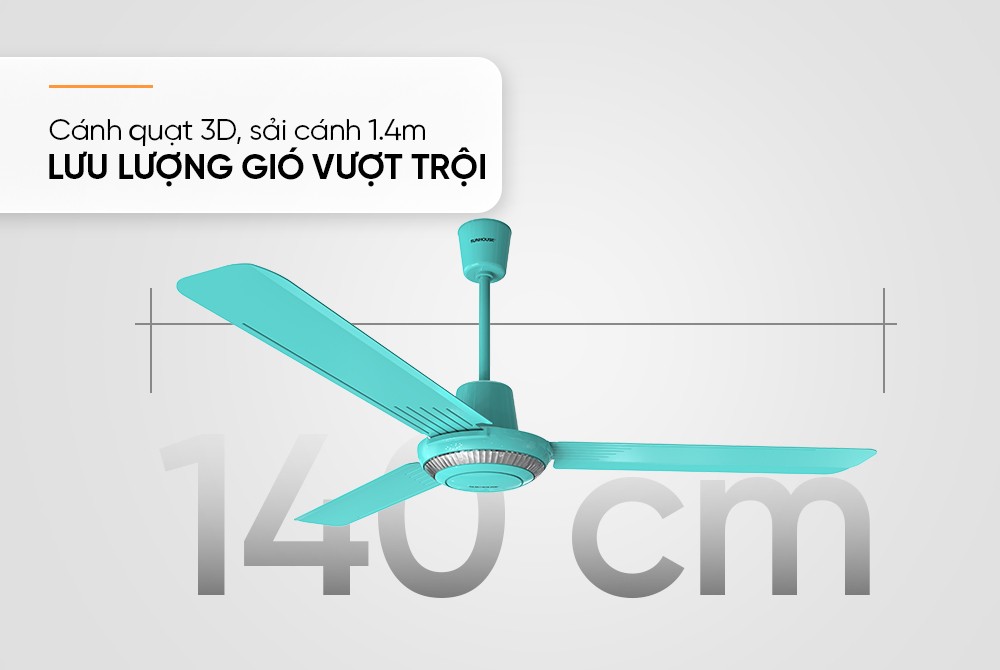 Quạt trần Sunhouse Apex SHD7659GR có thiết kế hiện đại, tạo điểm nhấn cho không gian như phòng khách, phòng ngủ, phòng làm việc, quán ăn hay showroom,...Sở hữu 3 cánh quạt có đường kính sải cánh 140cm, chiều dài ti 35cm. Cánh quạt 3D sải rộng, bằng thép cứng cáp, giúp tạo luồng gió mát rộng khắp cả không gian, giúp xua tan cái nóng oi bức trong những ngày nắng nóng.