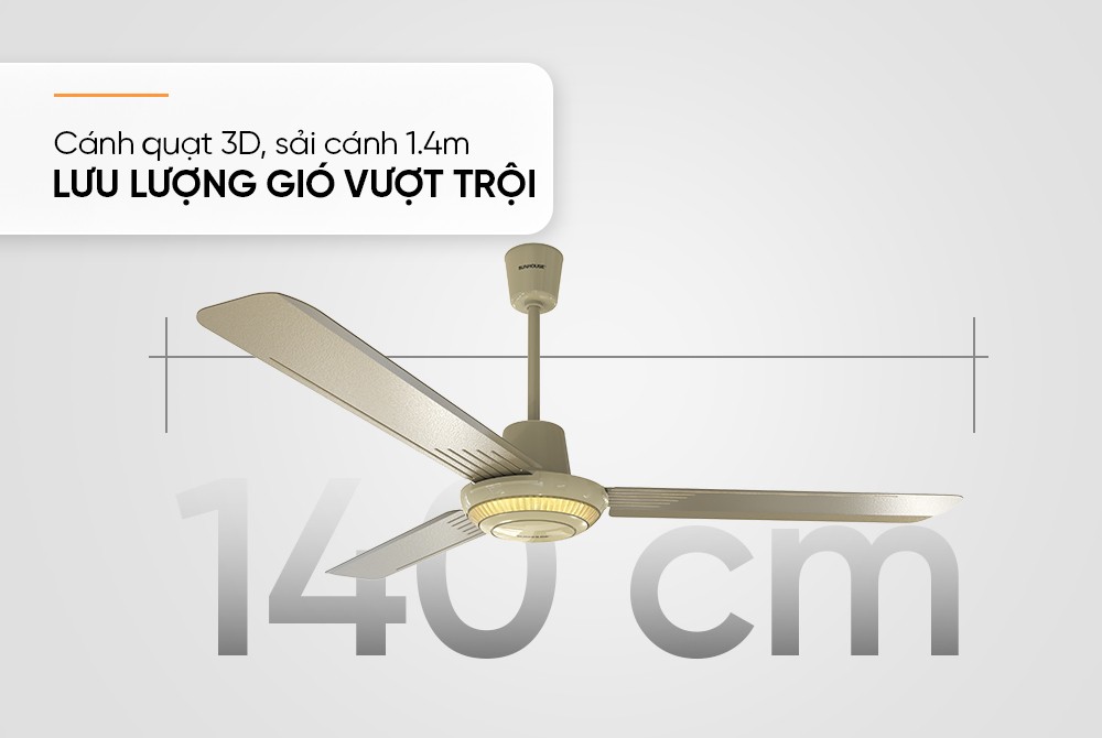 Quạt trần Sunhouse Apex SHD7659GY có thiết kế hiện đại, tạo điểm nhấn cho không gian như phòng khách, phòng ngủ, phòng làm việc, quán ăn hay showroom,...Sở hữu 3 cánh quạt có đường kính sải cánh 140cm, chiều dài ti 35cm. Cánh quạt 3D sải rộng, bằng thép cứng cáp, giúp tạo luồng gió mát rộng khắp cả không gian, giúp xua tan cái nóng oi bức trong những ngày nắng nóng.
