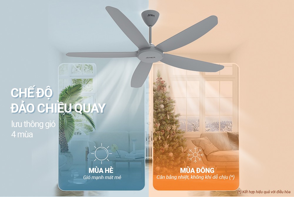 Vượt trội hơn quạt trần thông thường, quạt trần Sunhouse Apex trang bị thêm tính năng đảo chiều quay kết hợp với công suất 60W giúp làm mát không gian phòng nhanh chóng, động cơ hoạt động êm ái, hạn chế tiếng ồn, không ảnh hưởng đến hoạt động sinh hoạt của người dùng.
