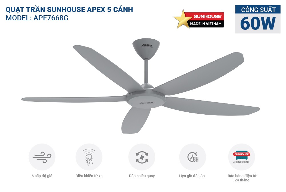 Thông số kỹ thuật Quạt trần Sunhouse Apex APF7668G