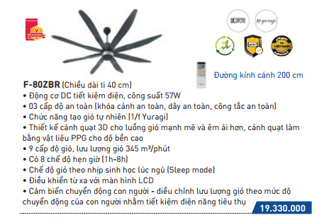 Sở hữu 8 cánh quạt có đường kính 200cm được làm từ vật liệu PPG với độ bền cao (chiều dài ti quạt 40cm) tạo ra làn gió mát rộng khắp cả không gian, giúp xua tan cái nóng oi bức trong những ngày nắng nóng.
