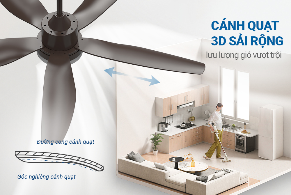 Quạt trần Sunhouse Apex APF7687 có thiết kế hiện đại, tạo điểm nhấn cho không gian như phòng khách, phòng ngủ, phòng làm việc, quán ăn hay showroom,...Sở hữu 5 cánh quạt có đường kính sải cánh 140cm. Cánh quạt 3D sải rộng, bằng nhựa ABS đẹp bền, giúp tạo luồng gió mát rộng khắp cả không gian, giúp xua tan cái nóng oi bức trong những ngày nắng nóng.