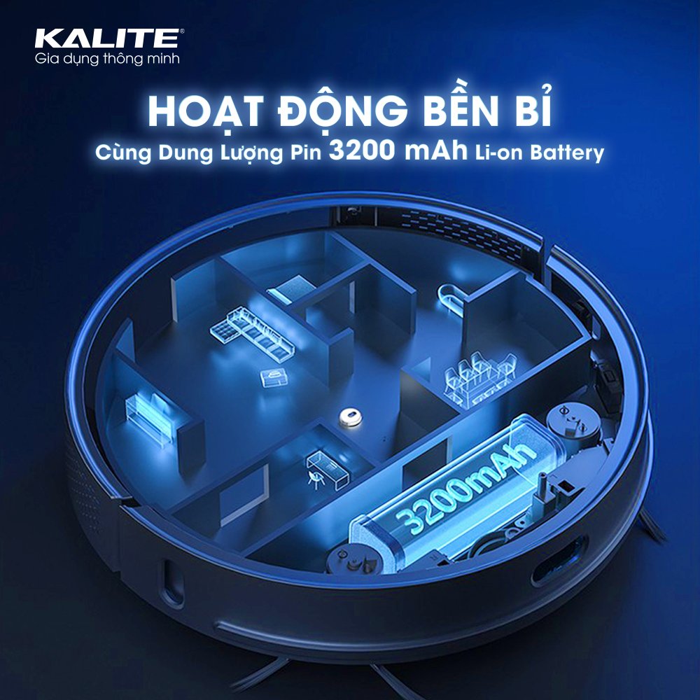 Với dung lượng pin 3200mAh li-on Battery, robot hút bụi có khả năng làm sạch liên tục 110 phút bao phủ diện tích 250m².