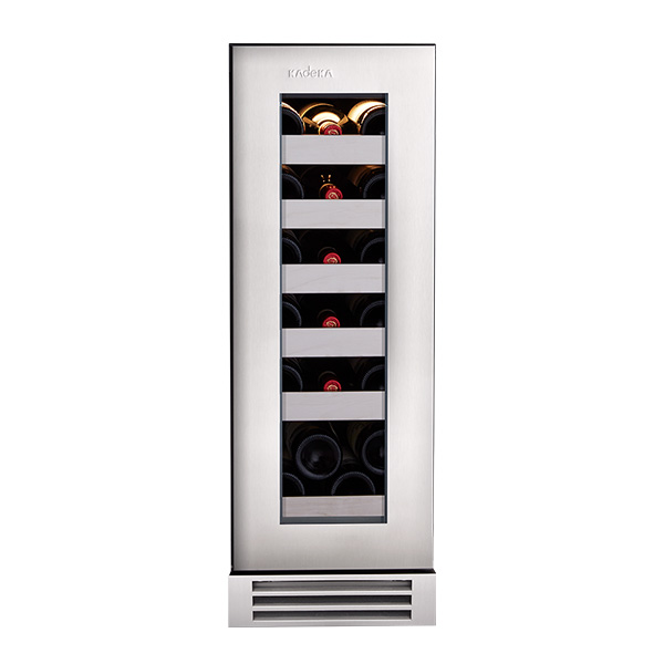 Tủ bảo quản rượu Kadeka KN24WR có 6 kệ gỗ được viền thép không gỉ với sức chứa đến 19 chai (dựa trên chai Bordeaunx chuẩn 0.75 lít). Tất cả rượu vang truyền thống sẽ được bảo quản cùng một nhiệt độ (Single Zone). Dòng sản phẩm này thích hợp để bảo quản vang trắng ở nhiệt độ 6-8ºC và vang đỏ ở nhiệt độ 16-18ºC.