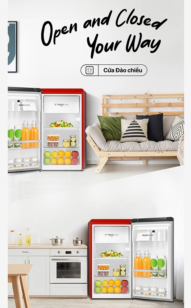 Tiêu chí tiết kiệm không gian tối ưu, tủ lạnh HR08DW nổi bật với khả năng thay đổi chiều mở cửa giúp thuận tiện lắp đặt trong mọi không gian.