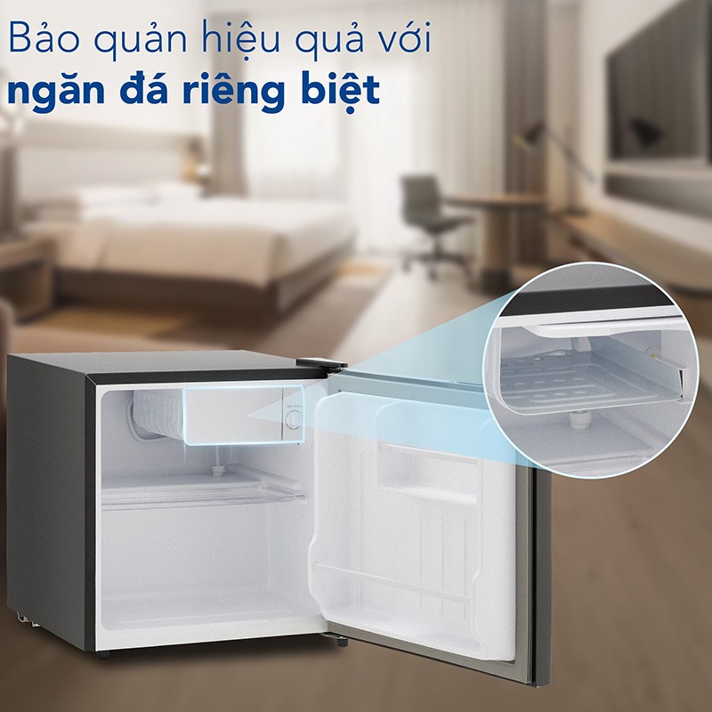 Tủ lạnh có dung tích sử dụng 46 lít phù hợp với nhiều không gian phòng, đặc biệt là những nơi hạn chế về diện tích. Tuy thế nhưng tủ lạnh vẫn đảm bảo về khả năng chứa, nhiều không gian cho nhiều loại thực phẩm với khay ngăn cách chắc chắn (tủ lạnh chỉ có ngăn mát, không có ngăn đông). Bên phía cửa tủ lạnh cũng có 2 ngăn dành để đựng nước uống, các loại gia vị,....
