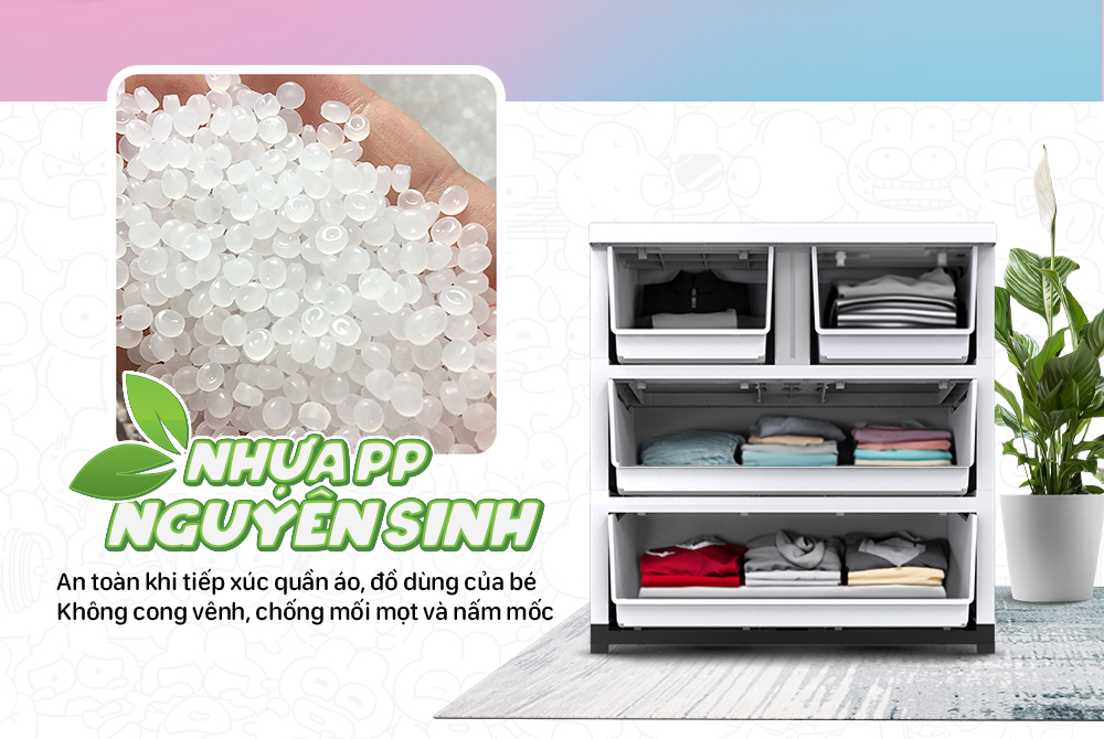 Tủ được làm từ chất liệu nhựa PP nguyên sinh. Chất liệu này an toàn khi tiếp xúc với quần áo, đồ dùng.
