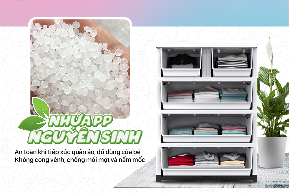 Tủ được làm từ chất liệu nhựa PP nguyên sinh. Chất liệu này an toàn khi tiếp xúc với quần áo, đồ dùng.