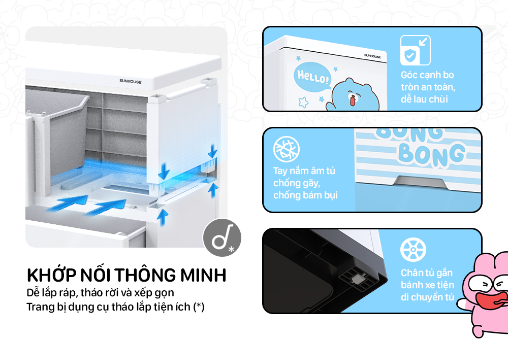 Tủ nhựa cứng cáp không cong vênh với các khớp ráp chắc chắn. Được thiết kế màu sắc và kiểu dáng đáng yêu, phù hợp với bé trai và bé gái.