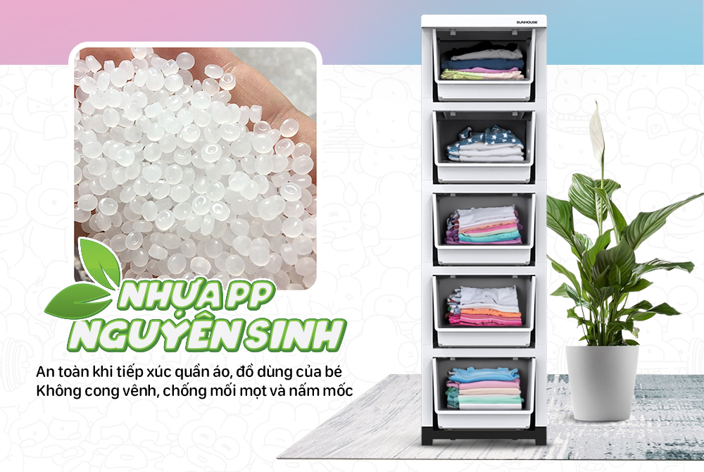 Tủ được làm từ chất liệu nhựa PP nguyên sinh. Chất liệu này an toàn khi tiếp xúc với quần áo, đồ dùng.